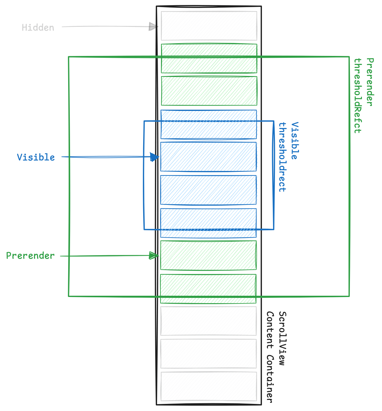 以下の図のように、表示領域から出たときに、自動的にアンマウントされてメモリが解放されます。 また、表示領域に近づいたときに、プリレンダリングされてスムーズなスクロール体験を実現できます。